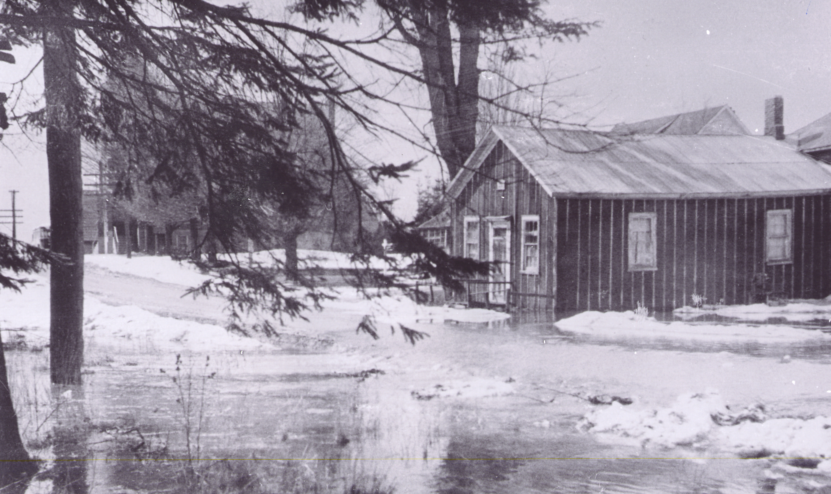 Stroud Orange Hall (1873-1958) on Victoria St., Stroud showing spring flood 1950 - from pg. 49 of Stroud Tweedsmuir History, Vol. II Orange Order, Stroud Stroud