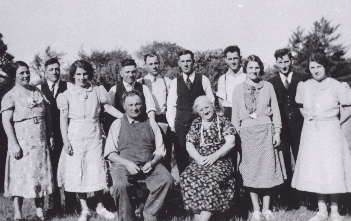 Photo of Mr. and Mrs. Walter and Elizabeth (née Harding) Corner on their 41st Wedding Anniversary, surrounded by their family. They lived in the "Squire" Grose home on Church Street in Lefroy from 1920. The home was known as "The Pines." The Corners owned the house and 200 acres, which were part of a much larger property owned previously by Squire Grose. Pictured in the photo standing [From left to right] are: Emily, Joseph, Mary Ann, John, Dick, Walter, Roland, Elizabeth, Frank, and Dorothy. Seated in the front row are Mr. and Mrs. Corner. The picture was taken in the spring or summer months.
