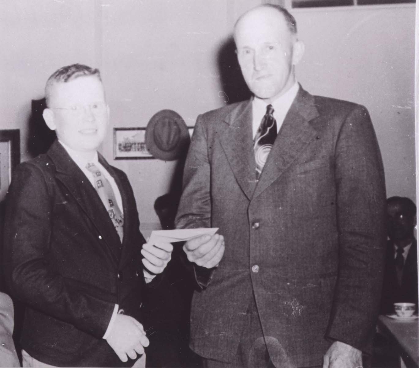 Plowing match - J. Cochrane farm W.W. Campbell presenting prize to youngest plowman. From P. 113 of Stroud Tweedsmuir History, Vol II Further information is available at the Knock Heritage Site