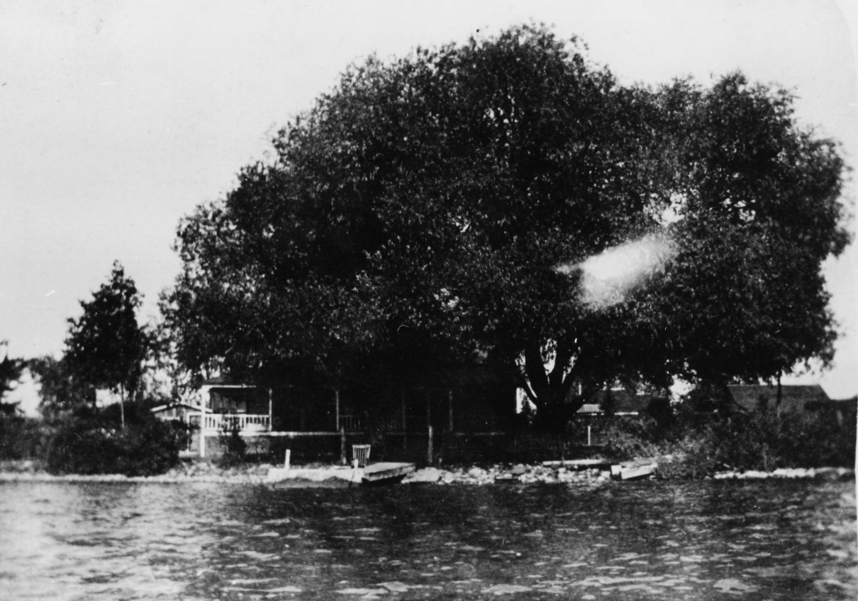Black-and-white photograph of a large lakeside tree with wide, dense foliage, partially obscuring a house behind it. The house has a covered porch and sits close to the water’s edge. A few small docks are visible on the shoreline. Identified as Chapman’s Farm House in Bell Ewart, later known as 'Twin Willows'.