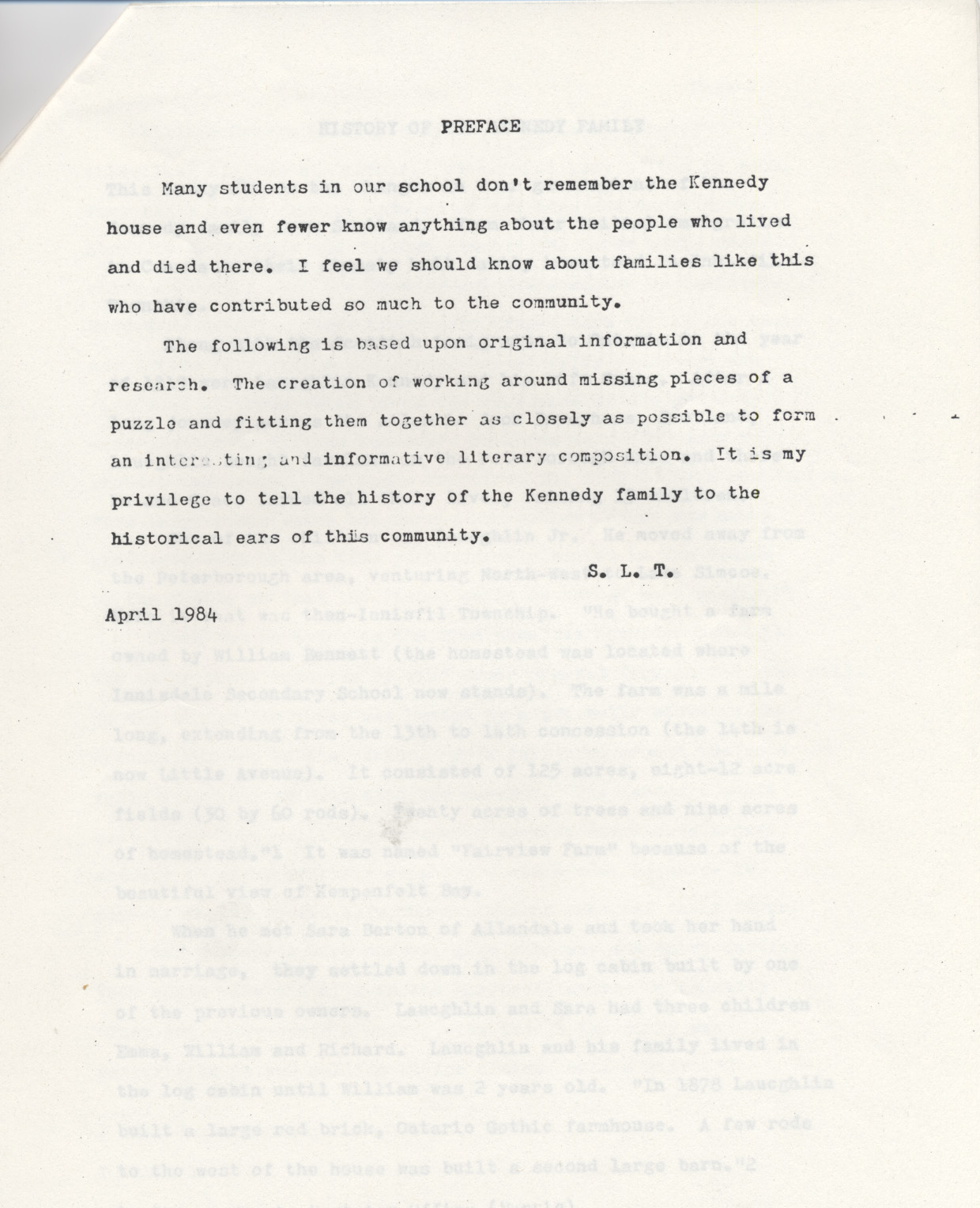 Scan of the first page of a History of the Kennedy family as prepared by Stacey Truax, Grade 10 pupil of Innisdale Secondary School in Barrie for a project. Innisdale Secondary School is located on part of what was once the Kennedy homestead, now on Little Avenue in Barrie. Prior to annexation, this was the 14th Concession of Innisfil. The remainder of the project is available at Knock heritage centre.