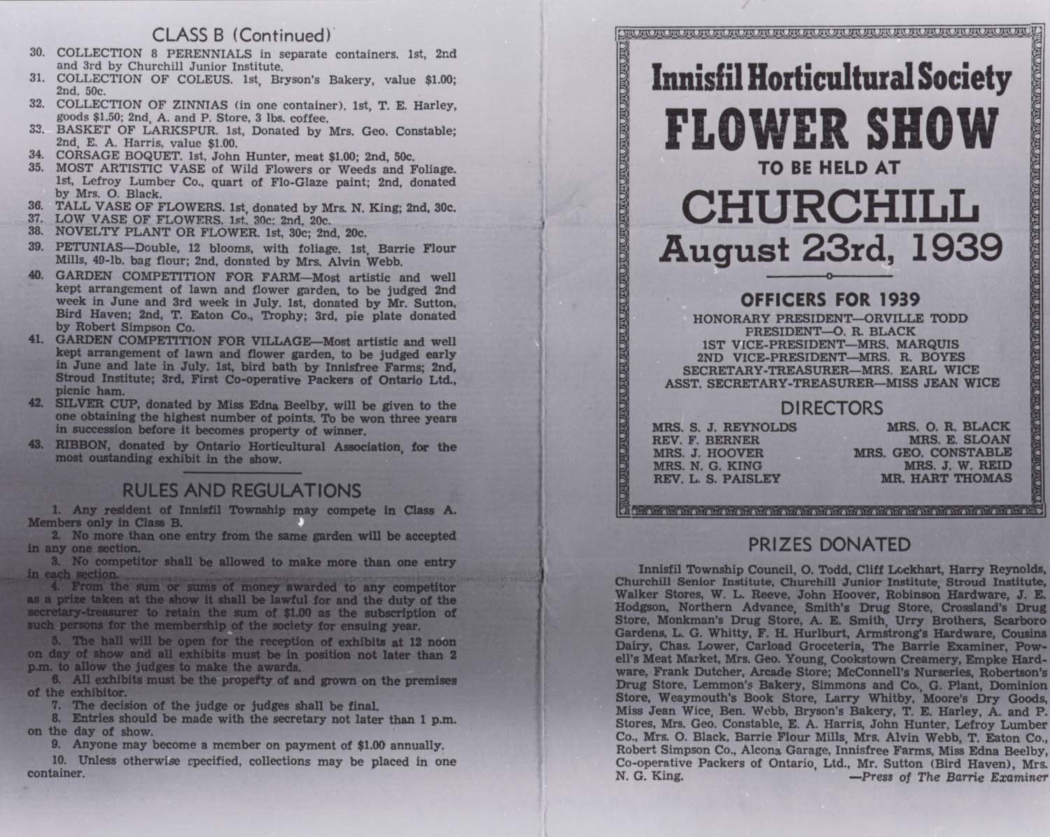Innisfil Horticultural Society Program - Flower show, Churchill 1939. Further information is available at the Knock Heritage Site