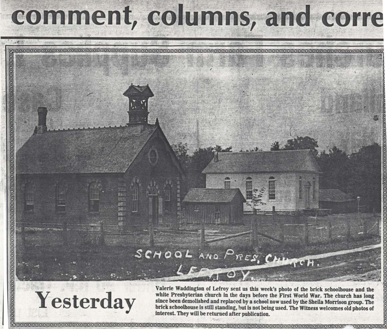 Newspper clipping showing Lefroy schoolhouse and Presbyterian church. Valerie Waddington of Lefroy sent us this week's photo of the brick schoolhouse and the white Presbyterian church in the days before the First World War. The church has long since been demolished and replaced by a school now used by the Sheila Morrison group. The brick schoolhouse is still standing, but is not being used. Further information is available at the Knock Heritage Site