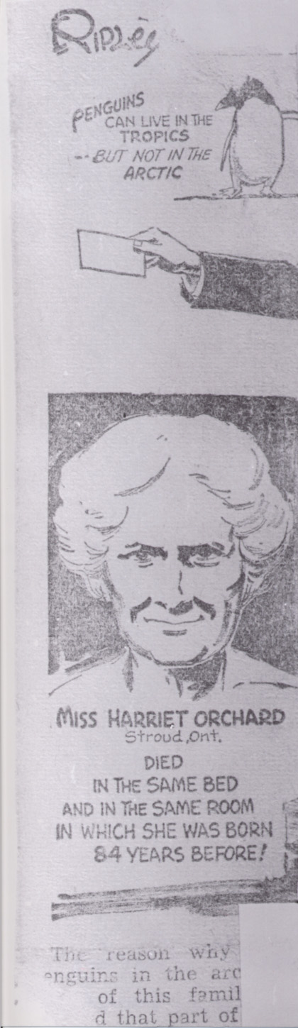 Lavinia and Harriet Orchard lived in Orchard residence - Stroud Harriet died in same bed and in the same room in which she was born 84 years before according to this article in paper - Ripley's believe it or not Orchard, Harriet Orchard, Lavinia