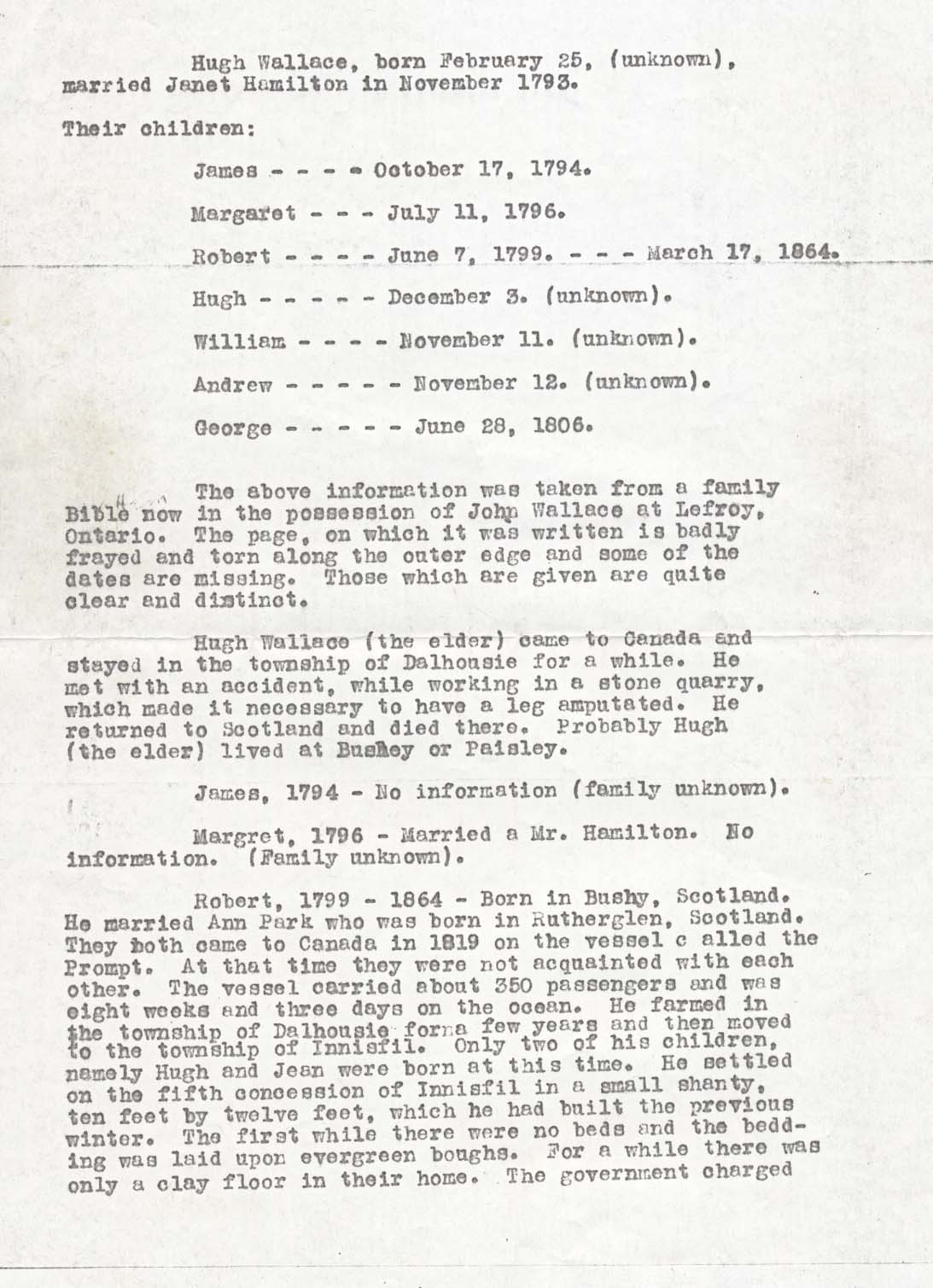 3 pages of information on the Robert Wallace Family antecedants and descendants. Notes taken from Andrew Wallace in 1924. Further information is available at the Knock Heritage Site