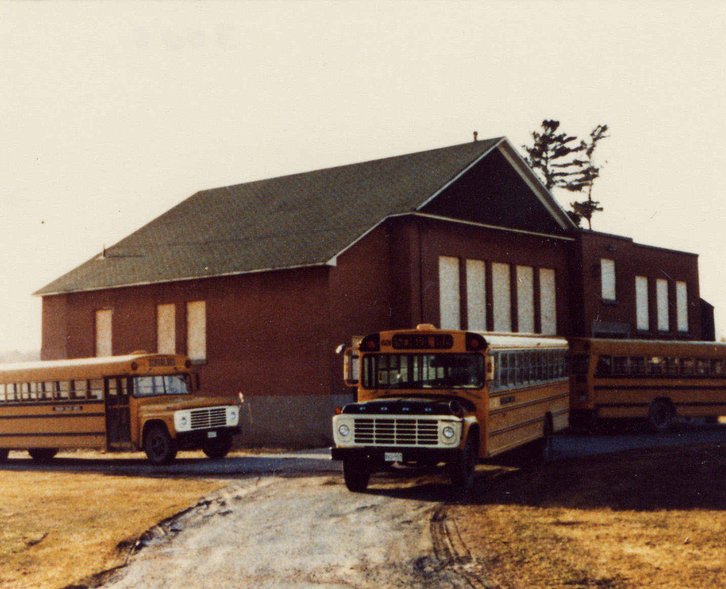 Lefroy Public School 1958 - 1975. At the closing of the Lefroy Continuation School in 1958 the building was taken over by Township School Area No. 1. The Industrial Arts machinery and Home Economics appliances were sold and the building was converted to four elimentary classrooms. Although the basement room was not too satisfactory. The buses in the picture transported surplus pupils from other schools in the area No. 1. See photograph No. 3507 for history of the Lefroy Continuation School.