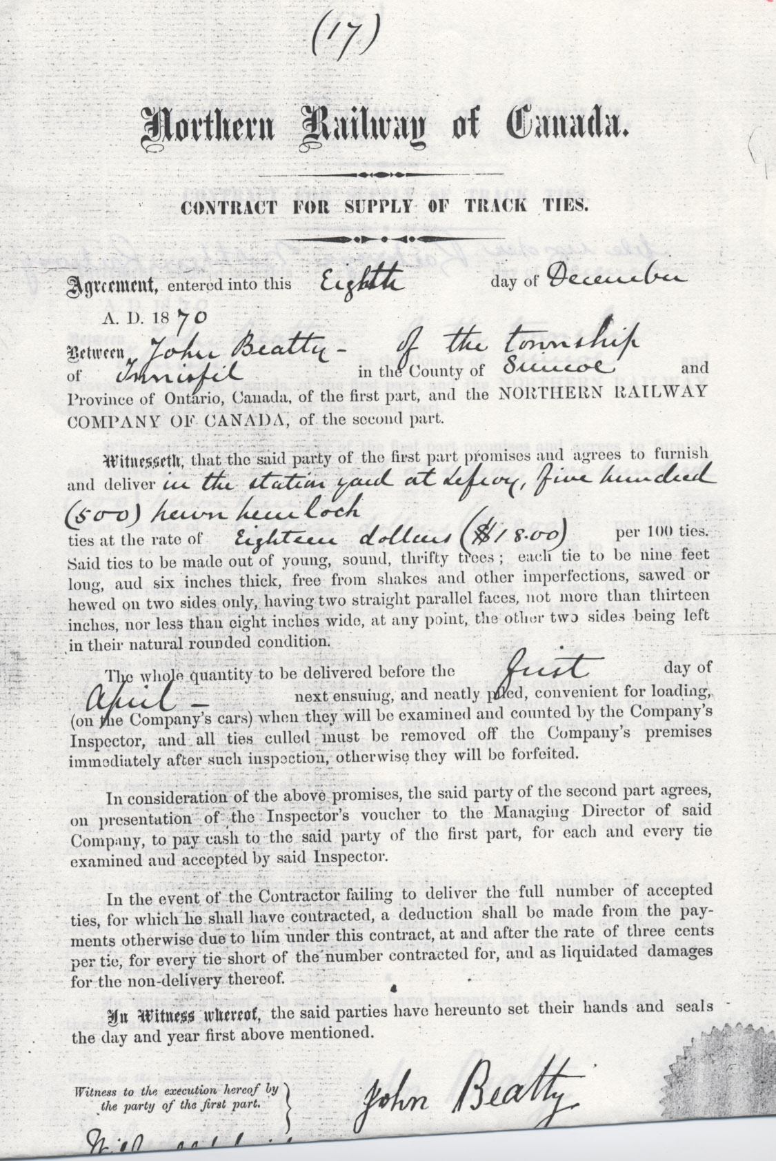 "Contract for supply of Track ties" between John Beatty and Northern Railway Further information available at the Knock Heritage Site