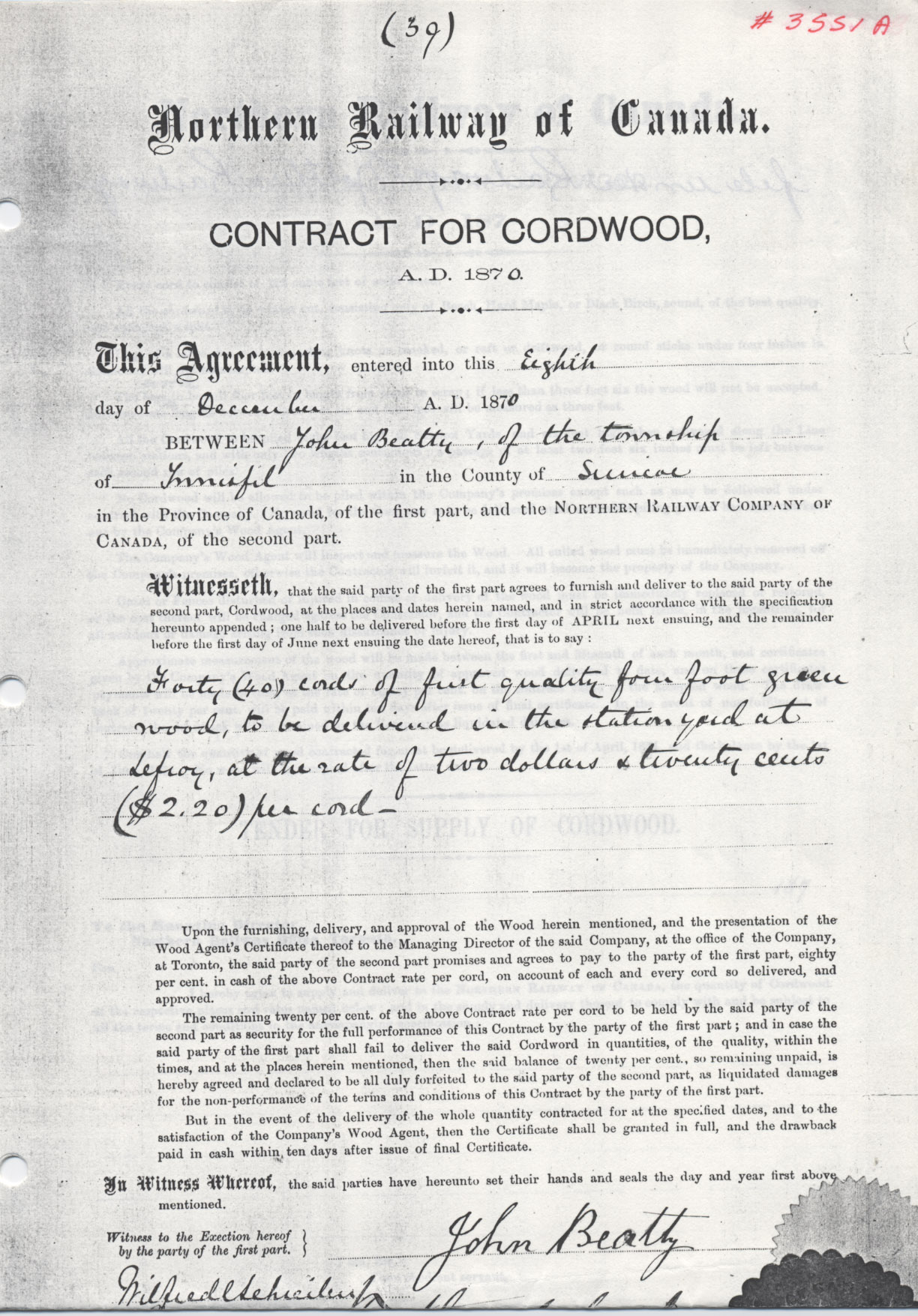 "Contract for cordwood" - between John Beatty and the Northern Railway Company -to supply the railway with wood at $2.20 per cord. Further information is available at the Knock Heritage Site