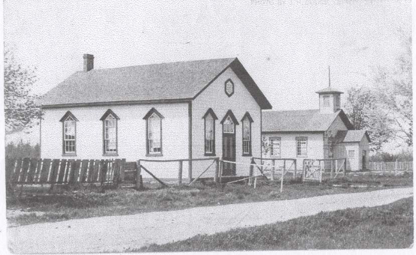 Belle Ewart Baptist Church on the left and Bell Ewart School (S.S. #5, Innisfil) on the right.