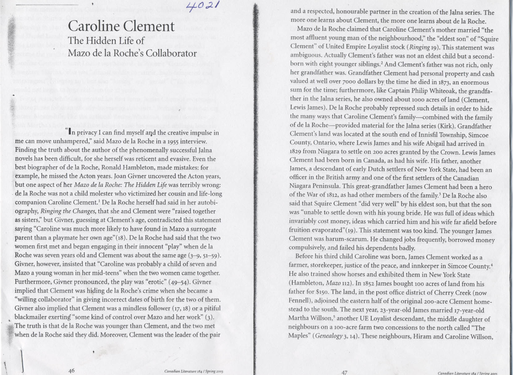 "Caroline Clement" The Hidden Life of Mazo de la Roches Collabarator. An article from Canadian Literature - 12 pages Further information is available at the Knock Heritage Site