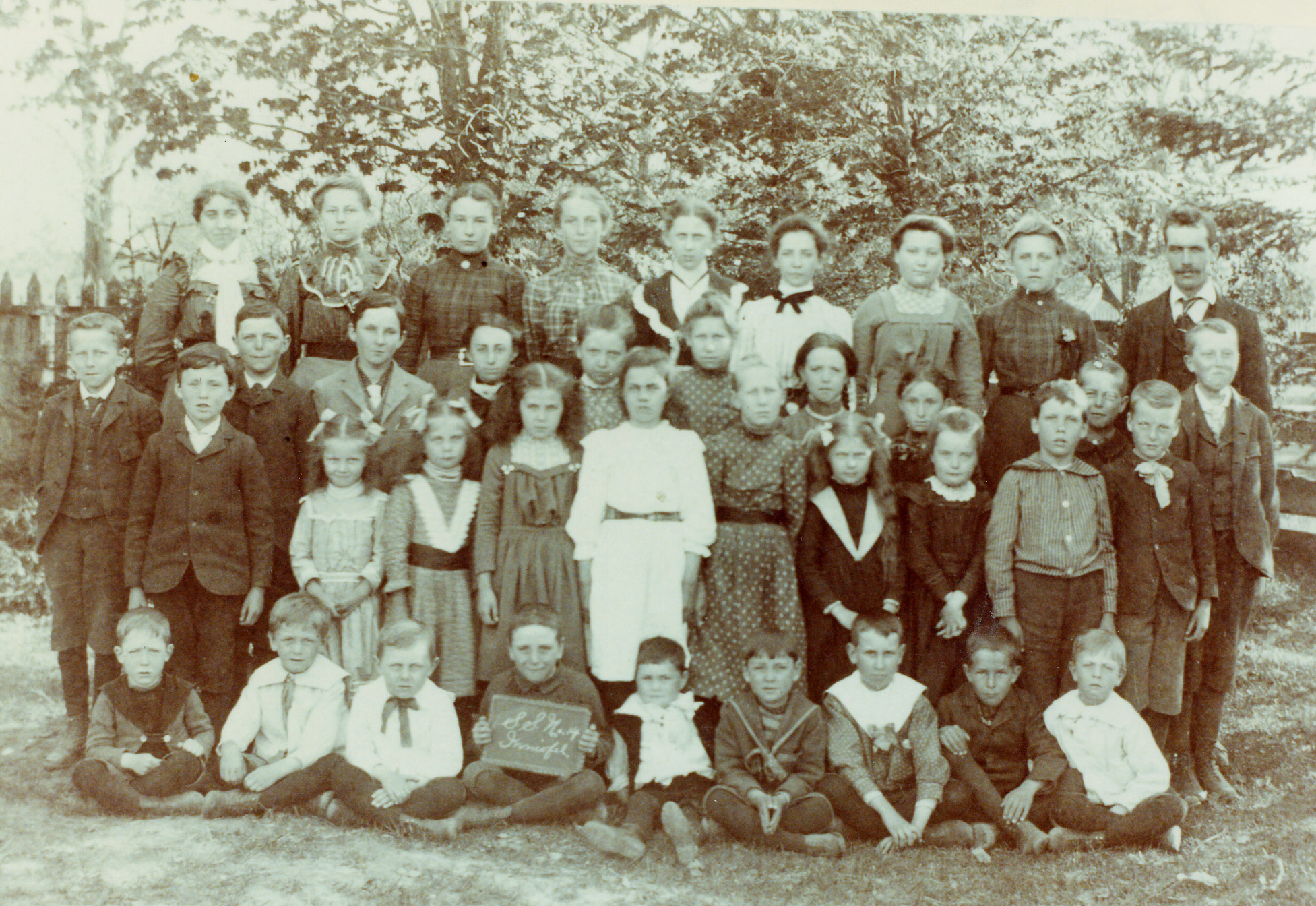 Students and Teacher at Big Bay Point School (the names are written on the back of the photograph by Mrs. Clara Elliott Andrews). Back Row: Nina Morrison, Clara Elliott, Pearl Soules, Jennie Elliott, Maggie Redfern, Gertrude Reid, Zelma Webb, Myrtle Guest, Ed Morrison (teacher), the name Russell McCabe is written as being to the right of the teacher but no one seems to be there; Second Row: Lloyd Guest, Billy Bell, Guelph Mayor, Gladys Mayor, Louie Elliott, Della Warnica, Clara Robinson, Hazel Mayor, Harry Elliott, Alf Webb Third Row: ____, Viola and Olive Elliott, Ireala Reid, Christina Cowan, Eva Warnica, Annie Refern, Jessie Webb, Edward Carr, Fred Webb Seated: George Armstrong, Jim Irwin, Bobbie Redfern, Lorne Robinson, Grant Mayor, Ward Mayor, Wallace Tribble, Eddie Elliott, Cecil Irwin.