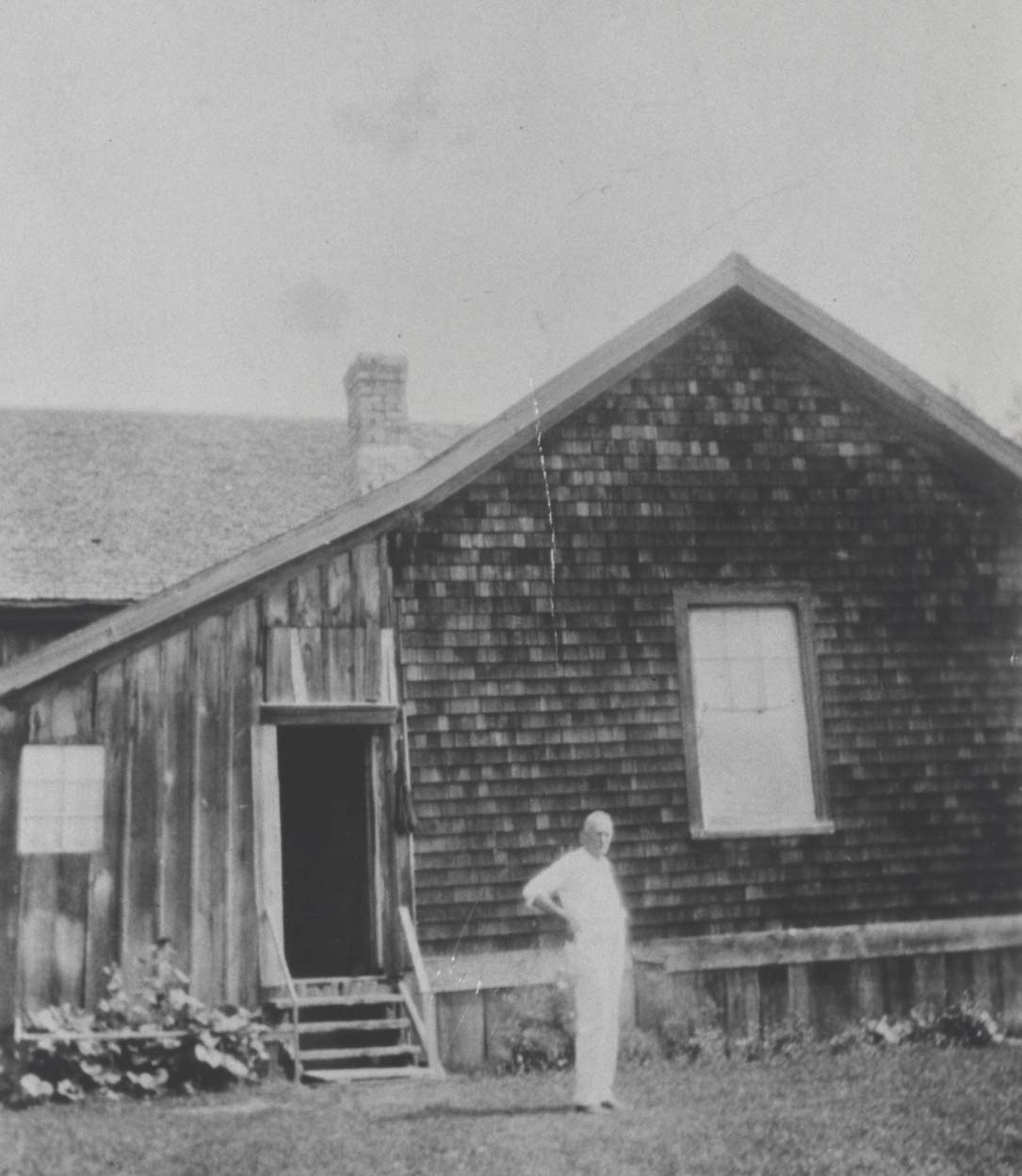 Mrs. Crosby's home in Bell Ewart, formerly the railway station master's home, showing the original siding on the back part of the house (board and batten). Railway tickets were sold from this house. The house was originally beside the railway spur to Bell Ewart and was located in what is now Bell Ewart Park and was moved to is present location before 1900. The man standing in front of the house is Mrs. Crosby's father, Captain Frederick Secord MacKay. He had the house shingled, likely before 1910. Mrs. Crosby had aluminum siding put on in 1976 or 1977.