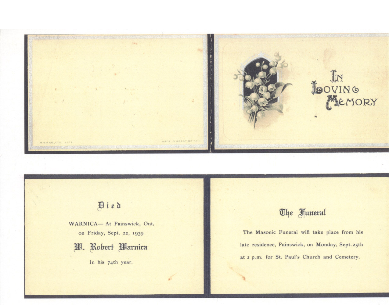 (B) Funeral Announcement of Bob Warnica Sept. 22, 1939 Further information is available at the Knock Heritage Site