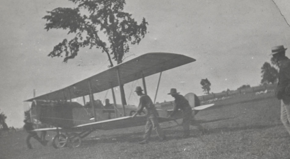 Photo of a biplane on a training flight from Camp Borden that made a forced landing on a farm field in the north half of Lot 19, Concession 7. The landing drew the attention of neighbours who came to see it. This information was provided by Ken Robinson from page 194 of the book "Skunks and Scholars." The photo shows several men alongside the plane, possibly pushing it for take-off.