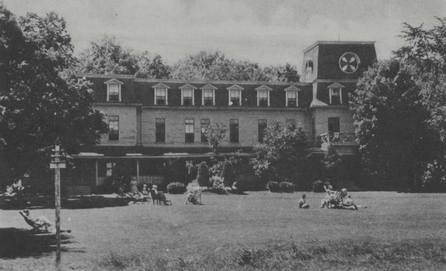 Post Card image of Peninsular Park Hotel on Big Bay Point. The photo shows several hotel guests seated in lawn chairs in the summer sun. Much of the building's wraparound verandah is obscured by the growth of trees and shrubs surrounding the three storey building. The hotel was popular in the early twentieth century and known as an aristocratic summer resort. Located on Big Bay Point and built in 1886 or 1887 it contained sixty guest rooms as well as a spacious rotunda and dining hall. It was known to attract American tourists interested in taking their holidays in the "wilds" of Canada.