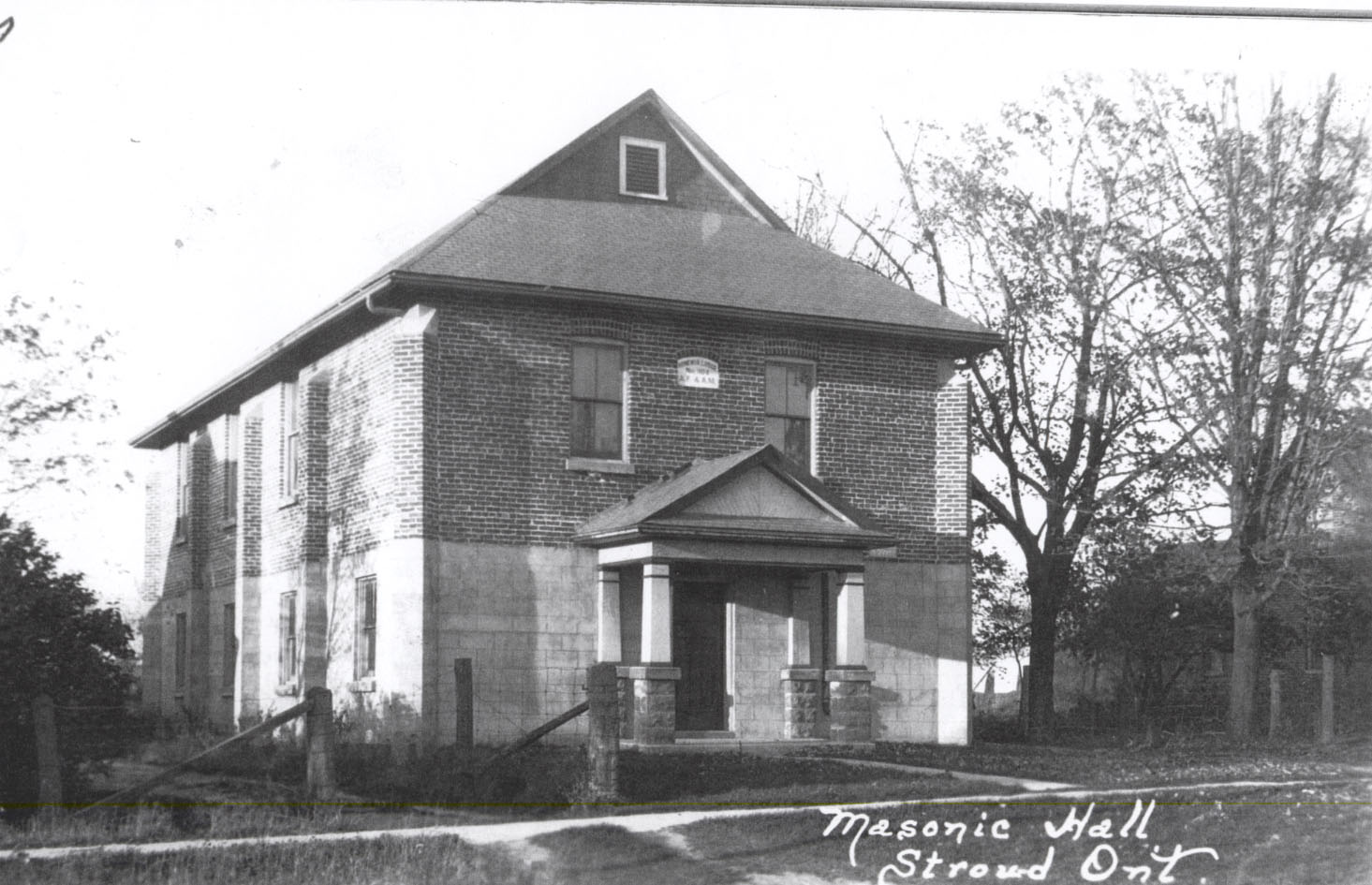 Exterior photo of the Masonic Hall in Stroud, which was built in 1923. The two-storey building is rectangular in shape with red brick denoting the second storey and grey blocks for the first with a Dutch gable style roof. It also features a Greek style porch at the entrance.