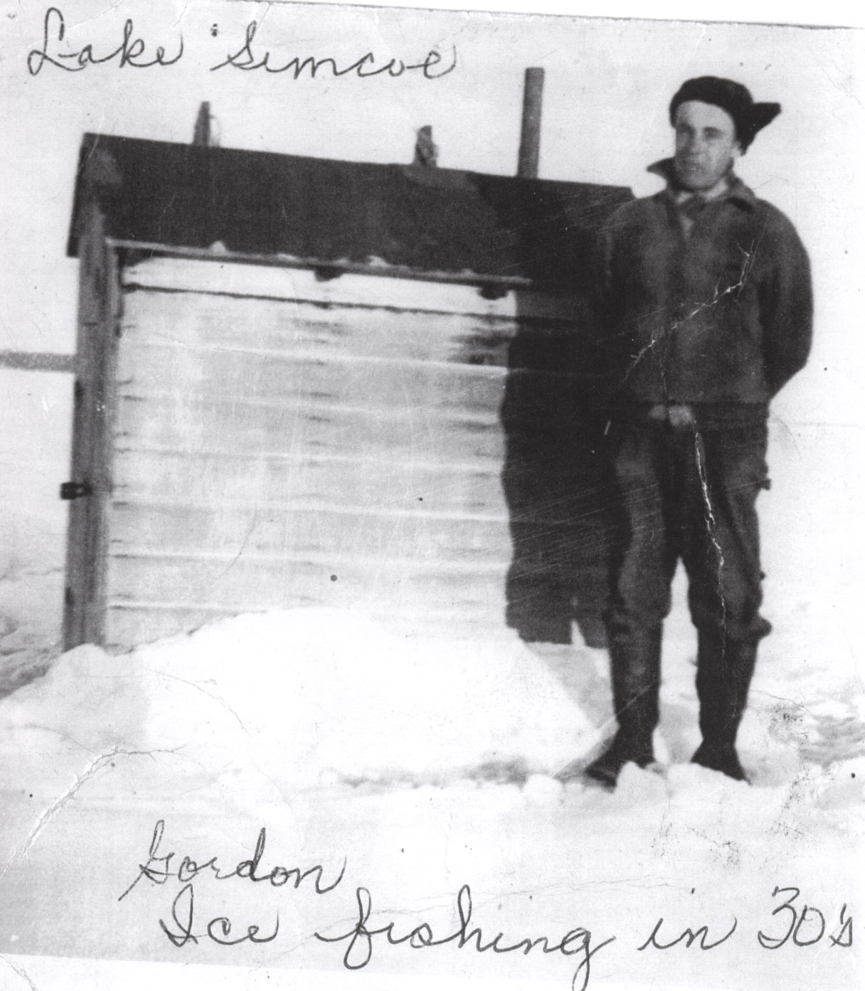 Avid ice fisherman Gordon Spring is pictured on Lake Simcoe, standing in front of his hut wearing a hat and winter clothing. Huts were hauled to the bottom of the 9th concession by means of a large sleigh and a team of horses. Gordon was the son of Isaac and Hettie (née Harmer) Spring. Bill and Tom Wright often took their huts to the lake at the same time.