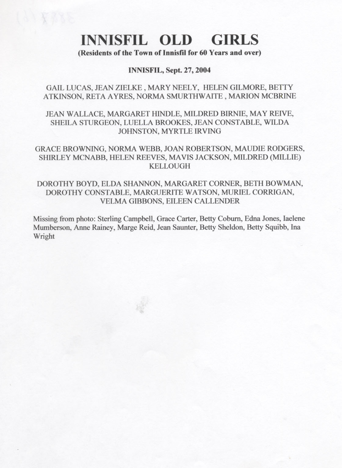 Innisfil Old Girls Photo - September 27, 2004 Names of women in Photo and others elegible who were absent