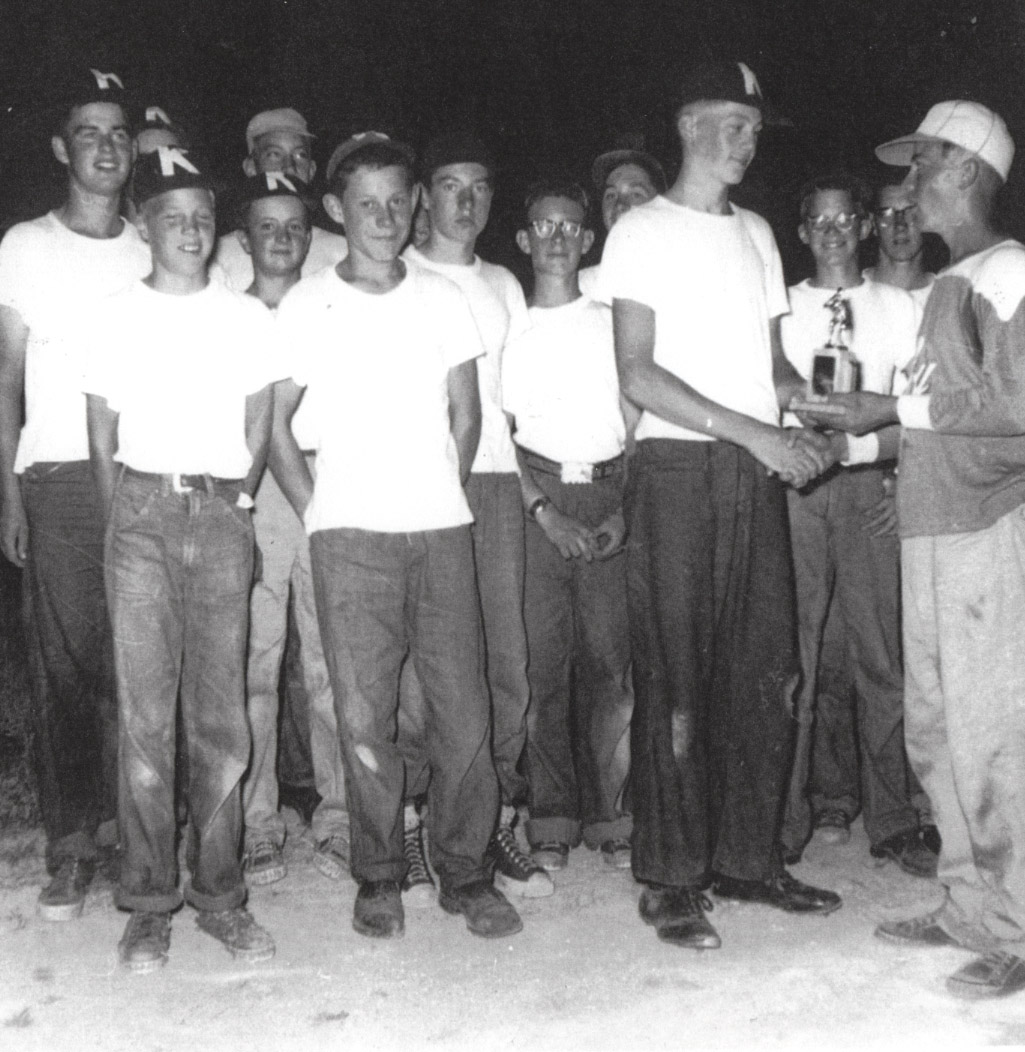 The 1956 Knock Juvenile Baseball Team. Players from Left: Donald Gibbons, Herbie Shannon, Mervin Wice, Ian Gray, Jimmy Sturgess, Peter Metcalf, Gordon Cowan, David Sturgess, Don Shannon, Earl Shannon, Ron Cowan, presenter unknown.