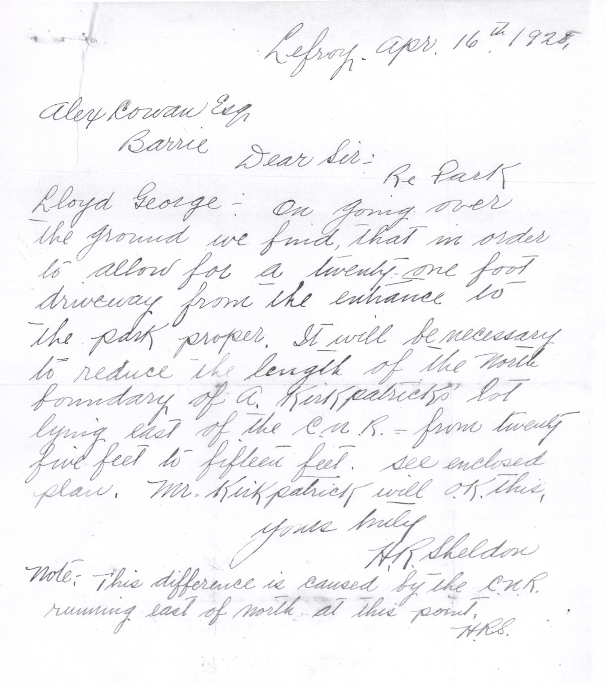 (A) Letter re adjustment for entrance to Lloyd George Park, Lefroy, On. East of R.R. Tracks in Village of Lefroy. Further information is available at the Knock Heritage Site # 3905 A