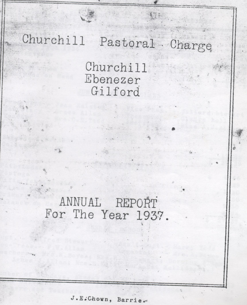 Annual Report - Churchill Pastoral Charge for 1937, including Ebenezer and Gilford. Entire document on file at the Heritage Centre.