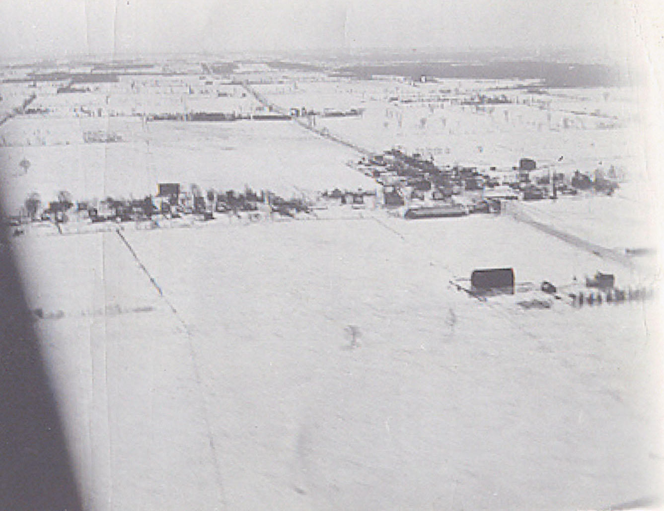 Aerial view of Stroud-taken from the north-east of the village by Keith Campbell an Australian pilot stationed at Camp Borden. He was training under the Commonwealth Air Training Plan. Further information is available at the Knock Heritage Site