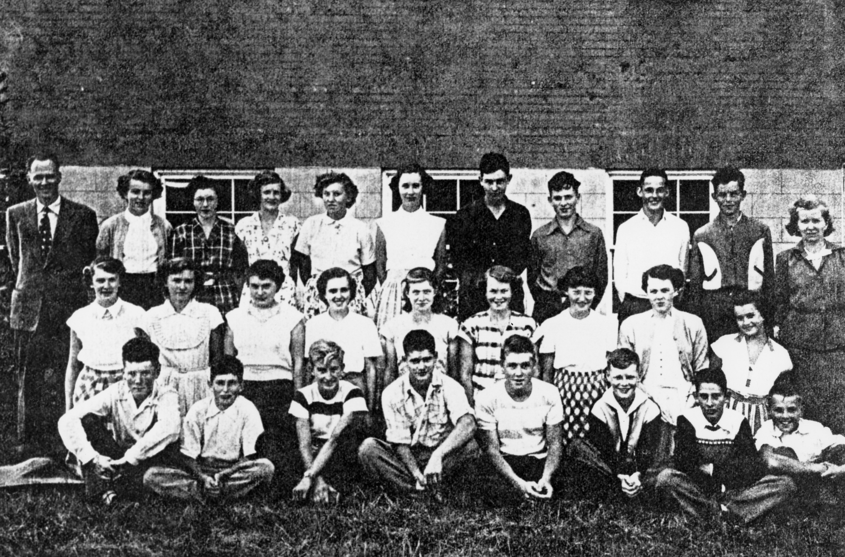 Lefroy Continuation School in the early 1950's: Back Row: Verna Noble, Margaret Campbell, Sylvia Kell, ____, Sheila Reive, Don King, Doug Reive, Paul Tuckey, ____King Second Row: Gwen Forbes, Betty Houston, Maryetta Atkinson, Kathy Browning, Betty Tillman, Anne Constable, Mae Prosser, ____, Marilyn Noble Front Row: Allan Browning, Noel Andrade, Don Sawyer, Alf Corner, Ian Jack, Tom King, Mel Saunders, Colin Jack