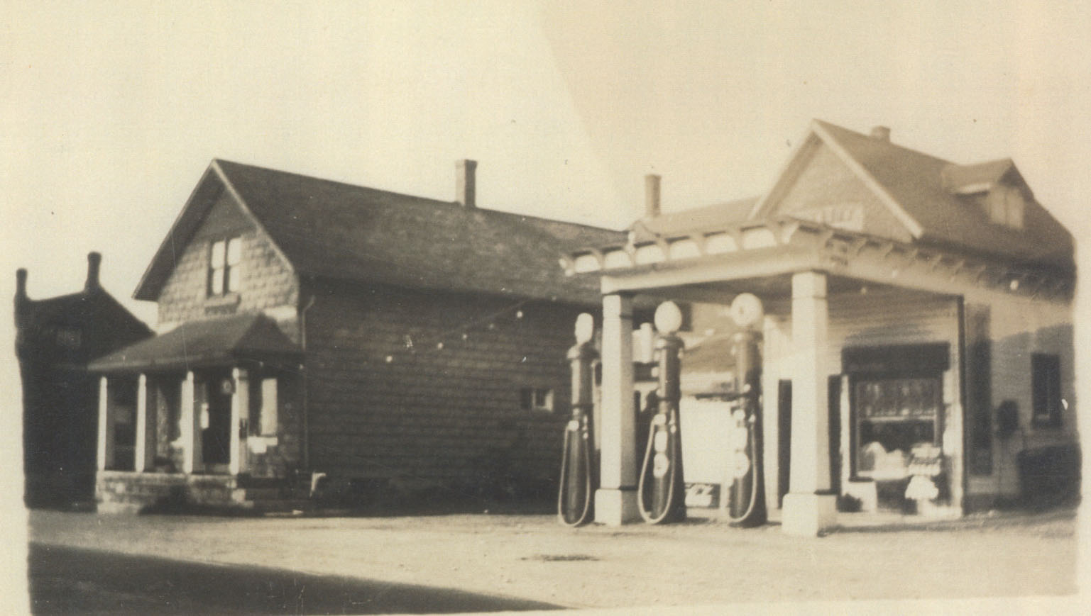 This is a photo of Johnston's Painswick Store and Gas Station, now the location of the Shell Gas Station and Car Wash. Further information is available at the Knock Heritage Site