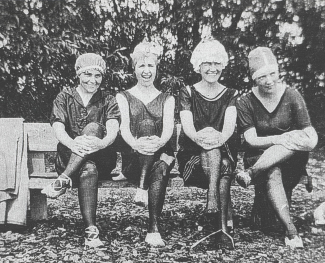 Four young women from Toronto in swiming costume at the end of Arnold Street in Belle Ewart. Left to right Emma Stockdale,_____,_____Scott, Annie Sydie.