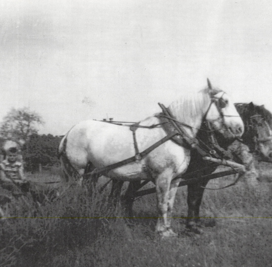 Photo of a young John Goodfellow driving a team of two horses named John and Jerry [one white one brown] on Maple Lane Farm, located on lot 23 of the 9th concession.
