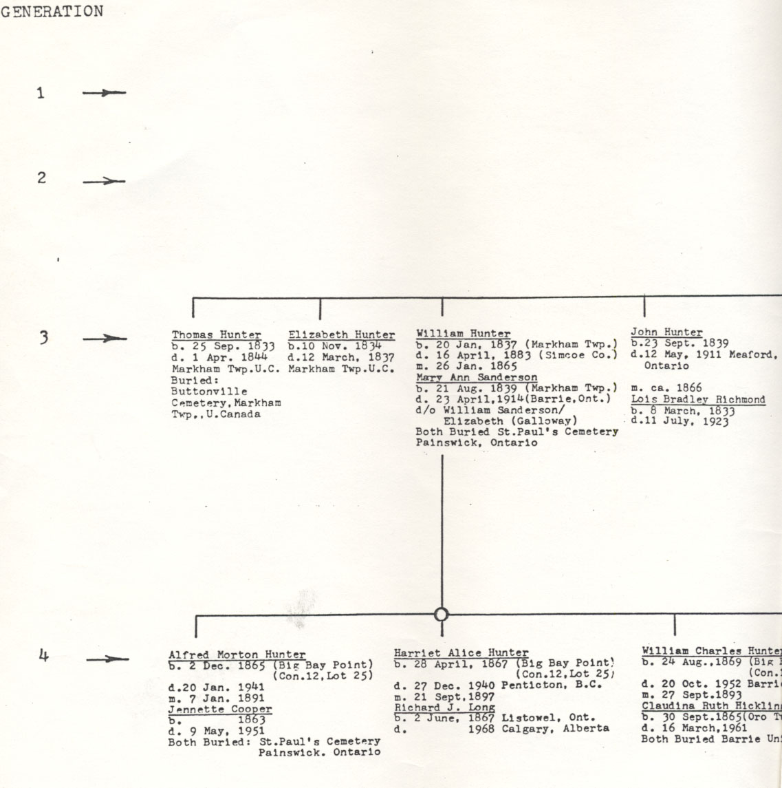 Generation Chart of Joseph Hunt including information on Hunter, Metcalf, Wilkinson families.