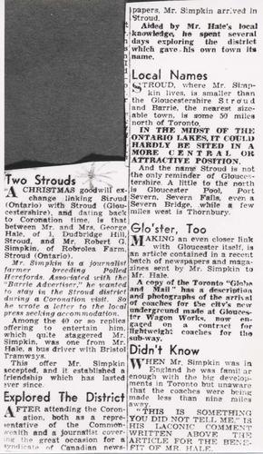 Newspaper clipping from English newspaper - re: R.G. Simpkin's visit to cover the Queen's coronation. "Two Strouds" etc. Simpkin, Robert g. Stroud