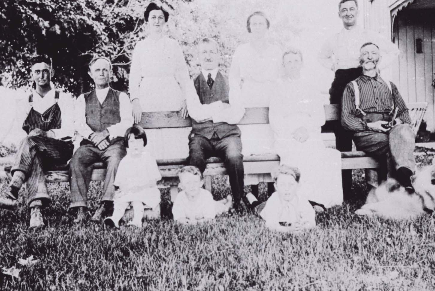 Sunday get-together at the Wright Homestead Standing: Ethel (Wright) Broley, Laura (Wright) McLachlan, George Wright Sitting on bench: Bertram Wright, Sam Broley, (unknown),Annie Wright (grandmother), Wm. Wright (grandfather) Front: Olive Broley (Mason), Clarence Broley, Howard Broley, Scrapper the dog Animals Costumes and clothing