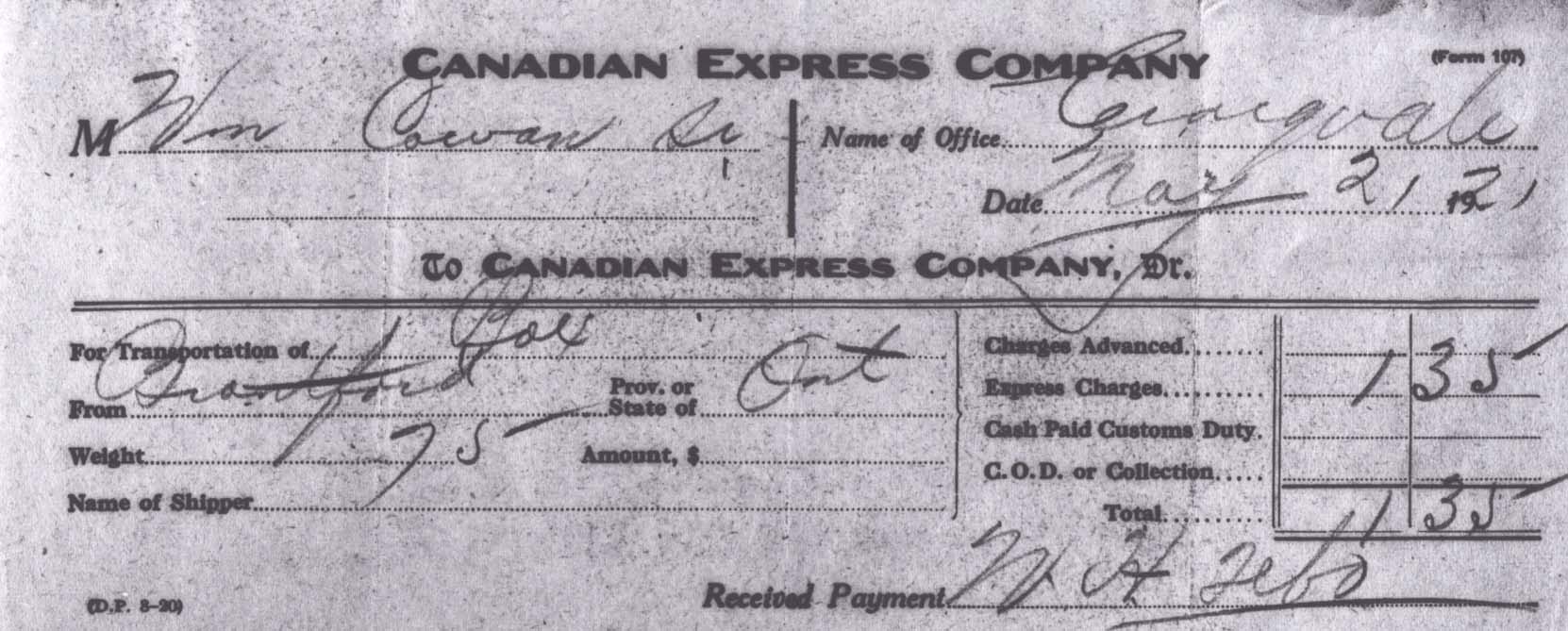 Canadian Express Company receipt issued at Craigvale station to Wm. Cowan Senior Railway Documents Cowan, Wm. Sr. Tebo, W.H.