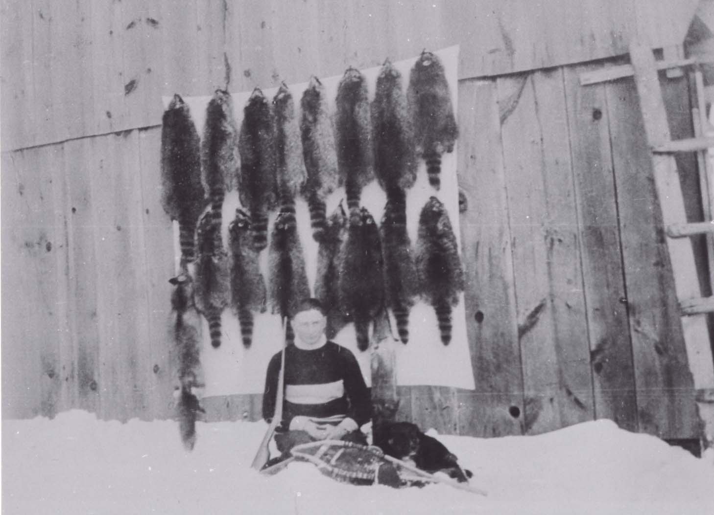 Photo of Bertram Wright seated in the snow and leaning against a wall on which a number of raccoon pelts have been mounted after a successful "coon" hunt. His snowshoes and rifle are propped beside and in front of him, and a black dog is curled up to his left.