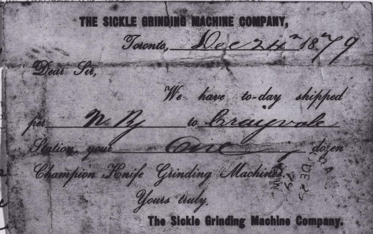 Notice of shipping of one dozen champion Knife Grinding Machines by N. Ry. to Craigvale from The Sickle Grinding Machine Company of Toronto Further information is available at the Knock Heritage Site