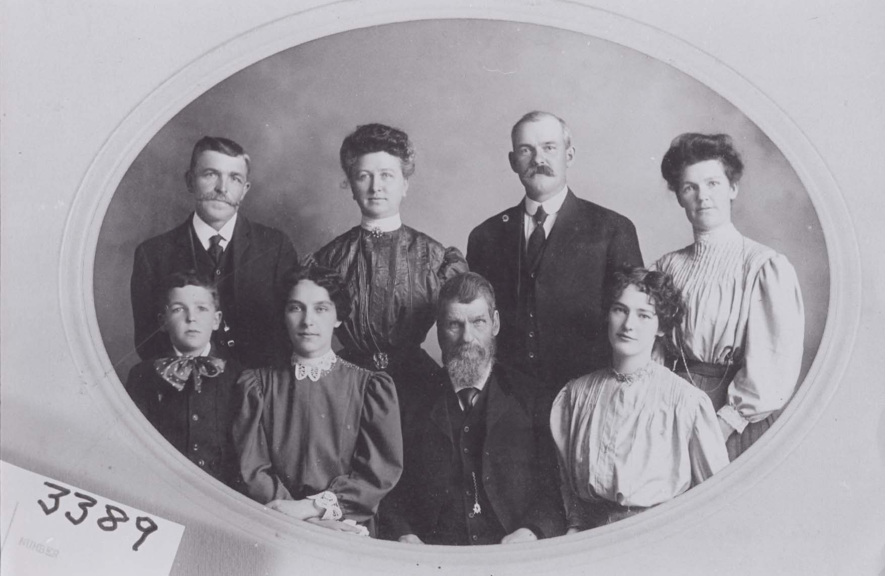 Samuel Maneer Family: Back row, Standing: George Young (1864-1937), Mrs. James Wesley Maneer (Janet Weir), James Wesley Maneer (1941),Mrs. George Young (Alice Maneer) Nov. 9,1873 - Dec. 23, 1907 Front Row, sitting: William S. Young (1898-1985, Olive Palmer, Samuel Maneer (7 July 1833-14 July 1923), May Palmer May and Olive Palmer grand-daughters of Samuel Maneer, children of Josiah Palmer (1859- 1904) and Annie Maneer (1864-1899) Samuel Maneer was a blacksmith at Craigvale Young, George; Maneer, Mrs. John Wesley; Weir, Janet;Young, William; Palmer, May; Palmer, Olive, Palmer, Joseph Costumes and clothing