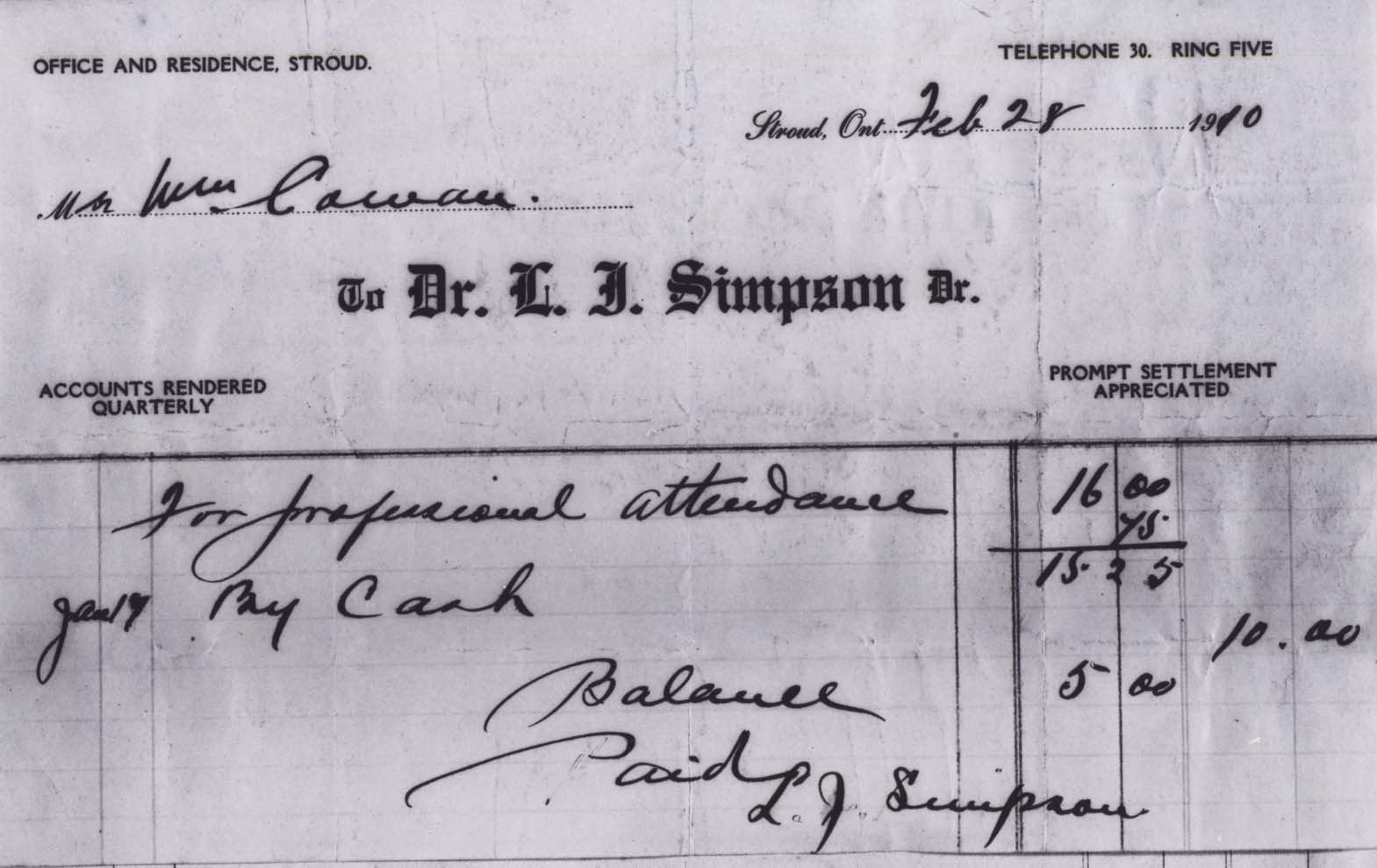 4 Receipts from Dr. L.J. Simpson, Stroud, to Mrs. Wm. Cowan. Further information is available at the Knock Heritage Site