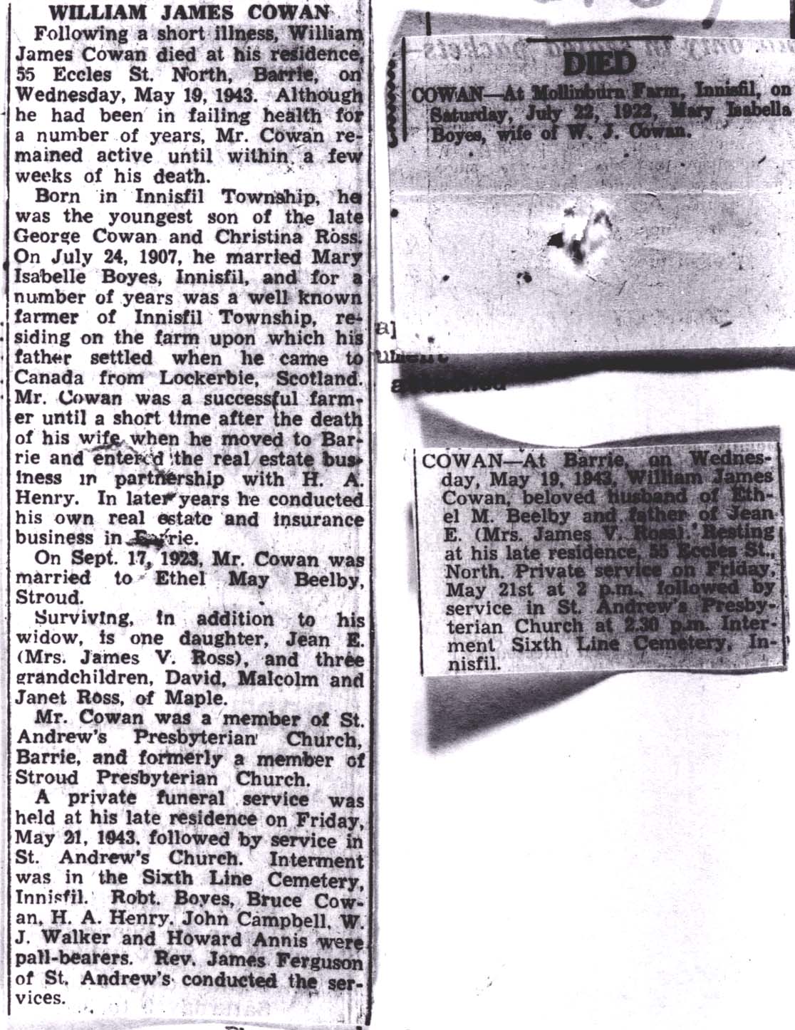 Obituary of William James Cowan Death notice of Mary Isabella Boyes, wife of W.J. Cowan Social events - funeral Mary Isabella Boyes Cowan William James Cowan