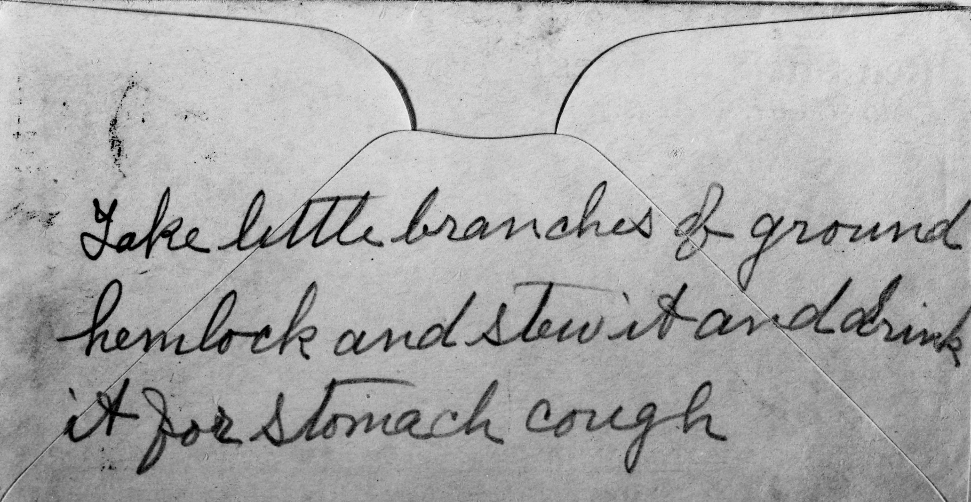 Medicinal Recipe. Take little branches of ground hemlock, stew it and drink it for stomach cough.