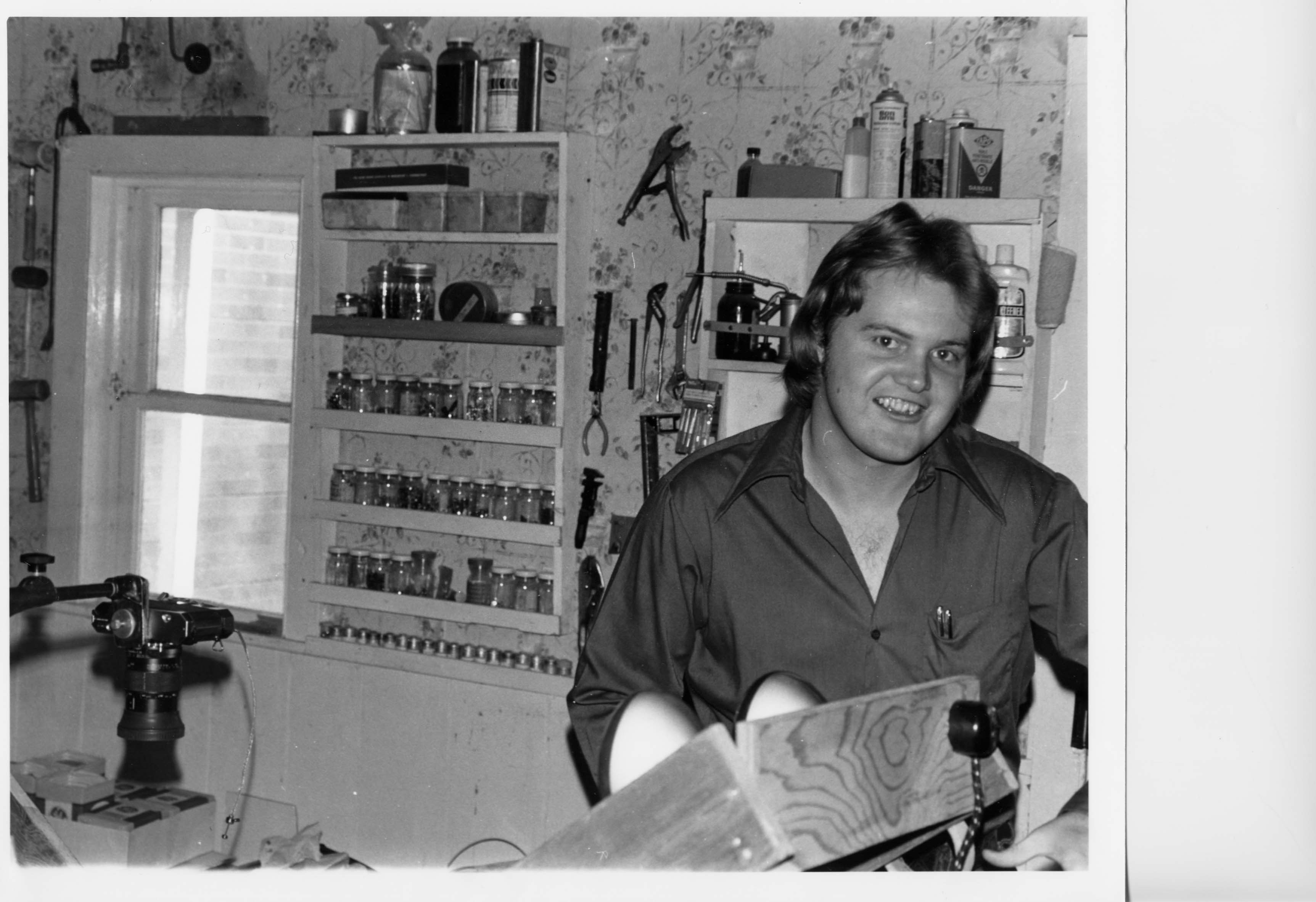 Bill Jamieson in workshop - at copy stand. Located in Tom Arnett's home. An Innisfil Historical Society Project.