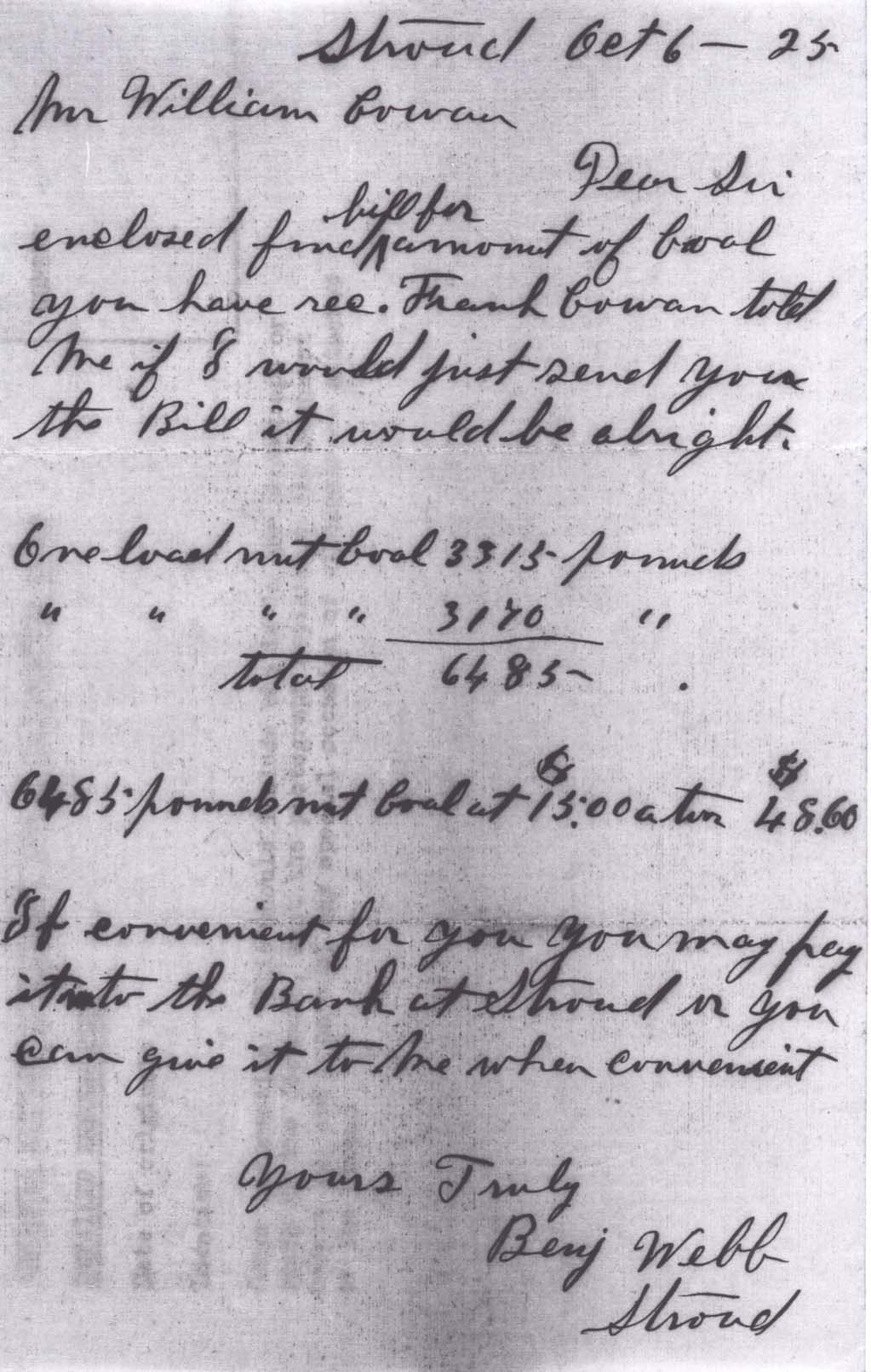 Business - Invoice for coal - to William Cowan from Benjamin Webb, Stroud Cowan, William Webb, Benjamin