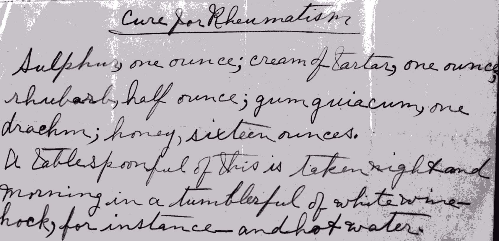Cure for Rheumatism - Sulphur one ounce, cream of tartar one once, rhubarb half an ounce, gum guiacum one dram, honey 16 ounces. A tablespoon of this is taken night and morning in a tumbler full of white wine-hock, for instance and hot water.