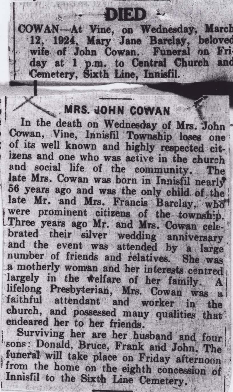 Death notice and obituary of Mrs. John Cowan nee Mary Jane Barclay Social Events - funeral Barclay, Mary Jane Cowan, Mrs. John
