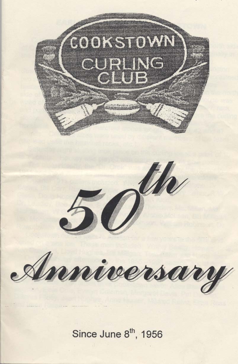Scan of the Cookstown Curling Club's 50th Anniversary programme. The page bears the Club's logo, two brooms crossing over a stone below the words Cookstown Curling Club, with the following text below: "50th Anniversary; since June 8th, 1956."