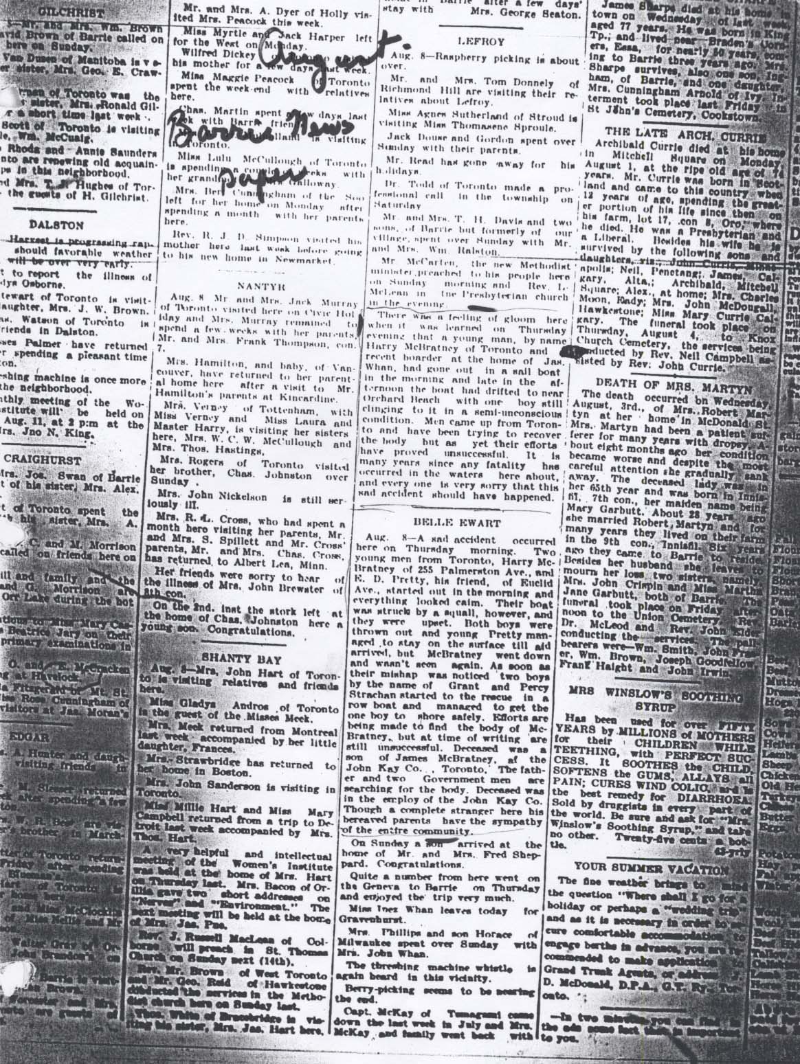 A page from a Barrie paper - not dated - month appears to be August. Lefroy and Belle Ewart news speaks of the drowning of Harry McBratney - a relative of Mrs. Alfred Gulston McBratney, Harry