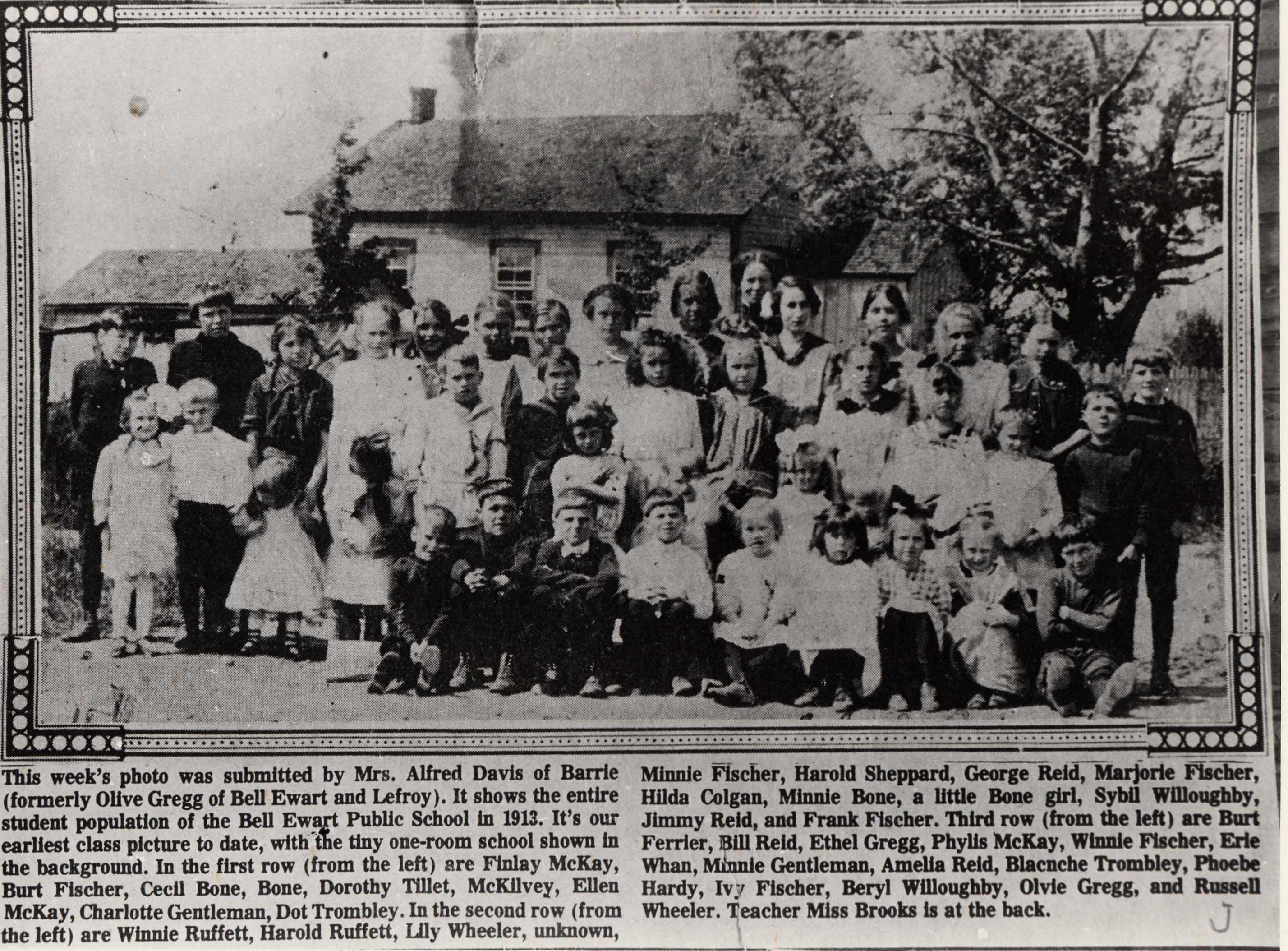 Clipping from the Barrie Newspaper. Belle Ewart Public School, 1913 . The caption reads "This week's photo was submitted by Mrs. Alfred Davis of Barrie (formerly Olive Gregg of Bell Ewart and Lefroy). It shows the entire student population of the Bell Ewart Public School in 1913. It's our earliest class picture to date, with the tiny one-room school shown in the background. In the first row (from the left) are Finlay McKay, Burt Fischer, Cecil Bone, Bone, Dorothy Tillet, McKilvey, Ellen McKay, Charlotte Gentleman, Dot Trombley. In the second row (from the left) are Winnie Ruffett, Harold Ruffett, Lily Wheeler, unknown, Minnie Fischer, Harold Sheppard, George Reid, Marjorie Fischer, Hilda Colgan, Minnie Bone, a little Bone girl, Sybil Willoughby, Jimmy Reid, and Frank Fischer. Third row (from the left) are Burt Ferrier, Bill Reid, Ethel Gregg, Phylis McKay, Winnie Fischer, Erie Whan, Minnie Gentleman, Amelia Reid, Blanche Trombley, Phoebe Hardy, Ivy Fischer, Beryl Willoughby, Olvie Gregg, and Russell Wheeler. Teacher Miss Brooks is at the back."