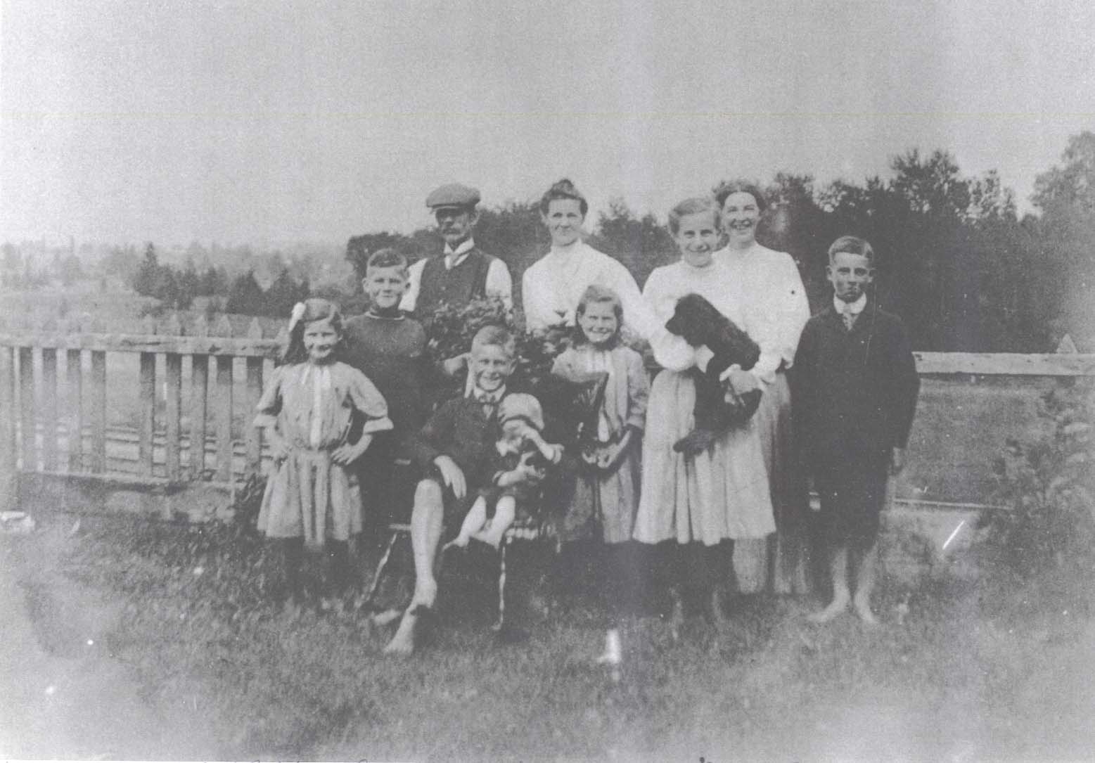 Image taken in 1904 of the family of Alfred Gulston. The family is posed outdoors in front of a wooden fence. They are wearing fine clothes with no shoes one. Left to right: back row: Alfred Gulston, Mary Jane (Wife to Alfred), Hannah Belle McBratney (an aunt). Front row: Grace, Fred, Charlie, with young William, May, Edith, Harry - all children of Mr. Alfred Gulston and wife.