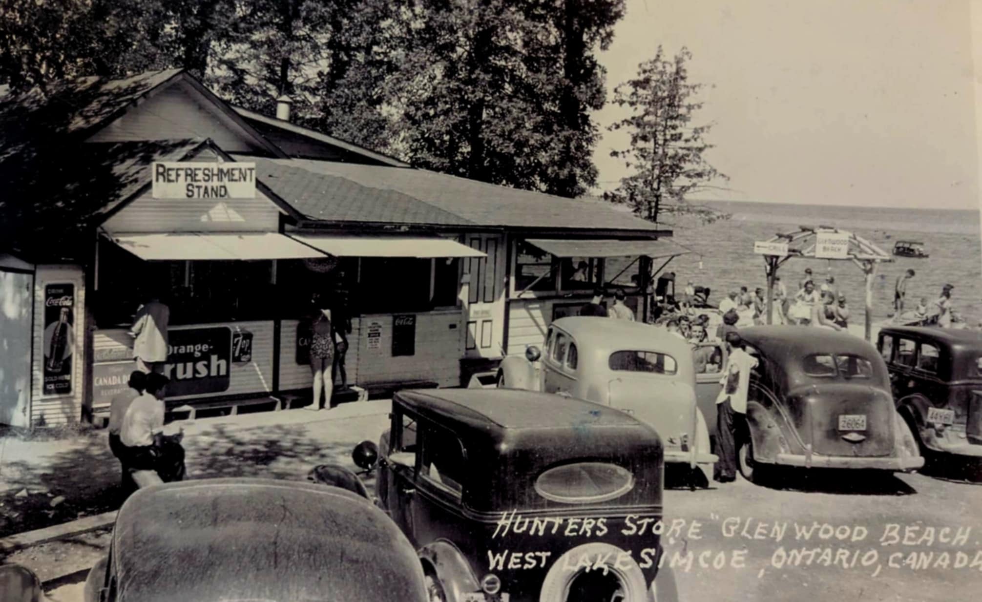 Hunters' Store at Glenwood Beach:- This property was first owned and built by R.G. Simpkin. George and Jean Hunter later converted it to a snack bar and a summer post office. They also had cabins for rent. Ray Florin later operated the Shoreroom Tavern, and lastly Jim Alder owned and operated a restaurant before it burned Circa 1980. Further information is available at the Knock Heritage Site