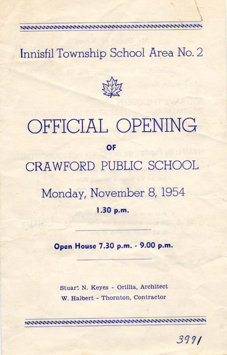 Crawford Public School S.S.12A. Official Opening November 8, 1954 Program Teacher Mrs. Audrey V. Halfyard Other photos of school and students at Knock Heritage Centre. Also photo of a tree planting ceremony